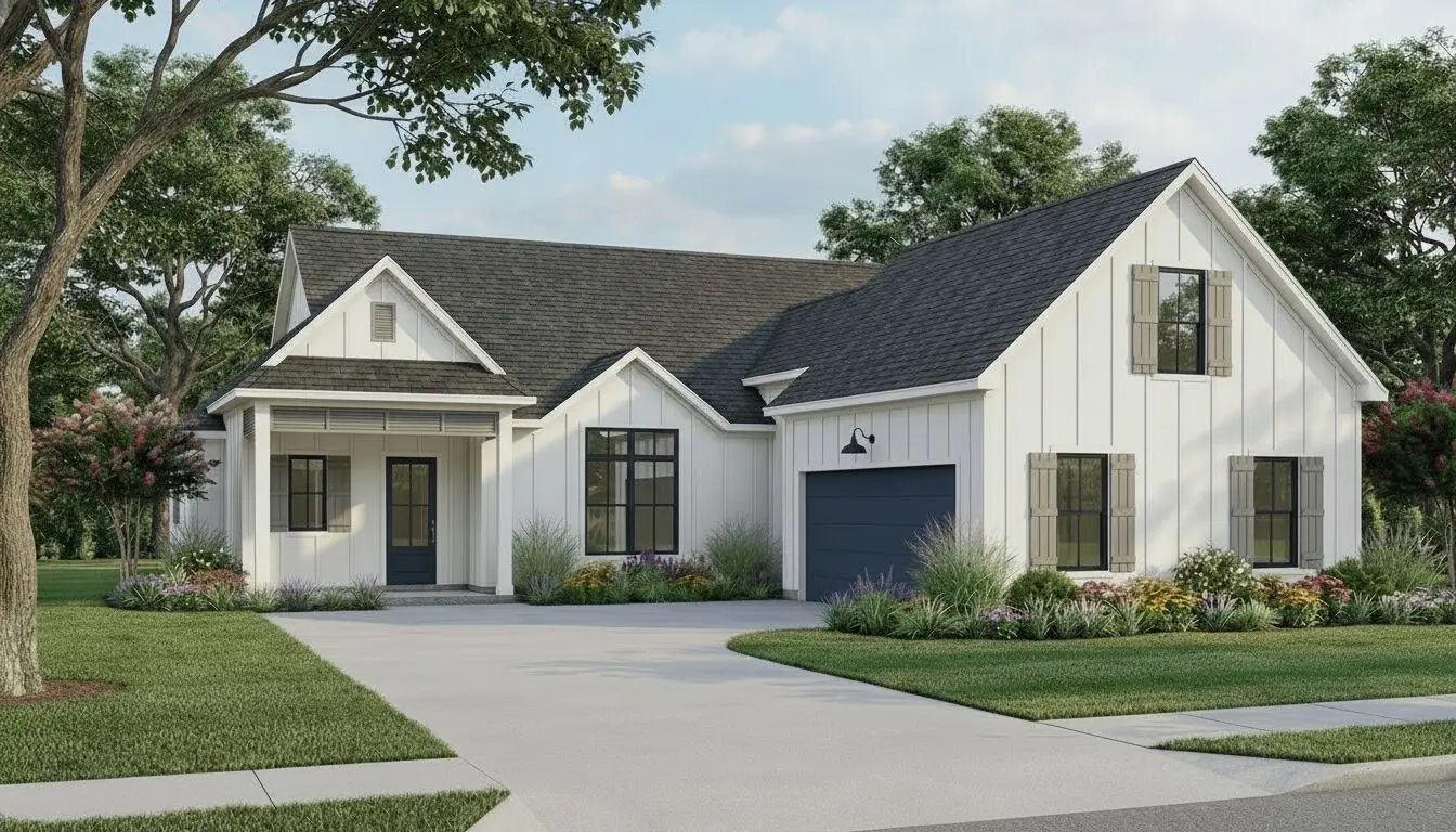 Step into the welcoming embrace of Plan 22-011, a Modern Farmhouse design that blends classic charm with contemporary living. As you approach, the high-contrast exterior, with its vertical white board-and-batten siding and dark architectural shingle roof, exudes a sense of warmth and sophistication.