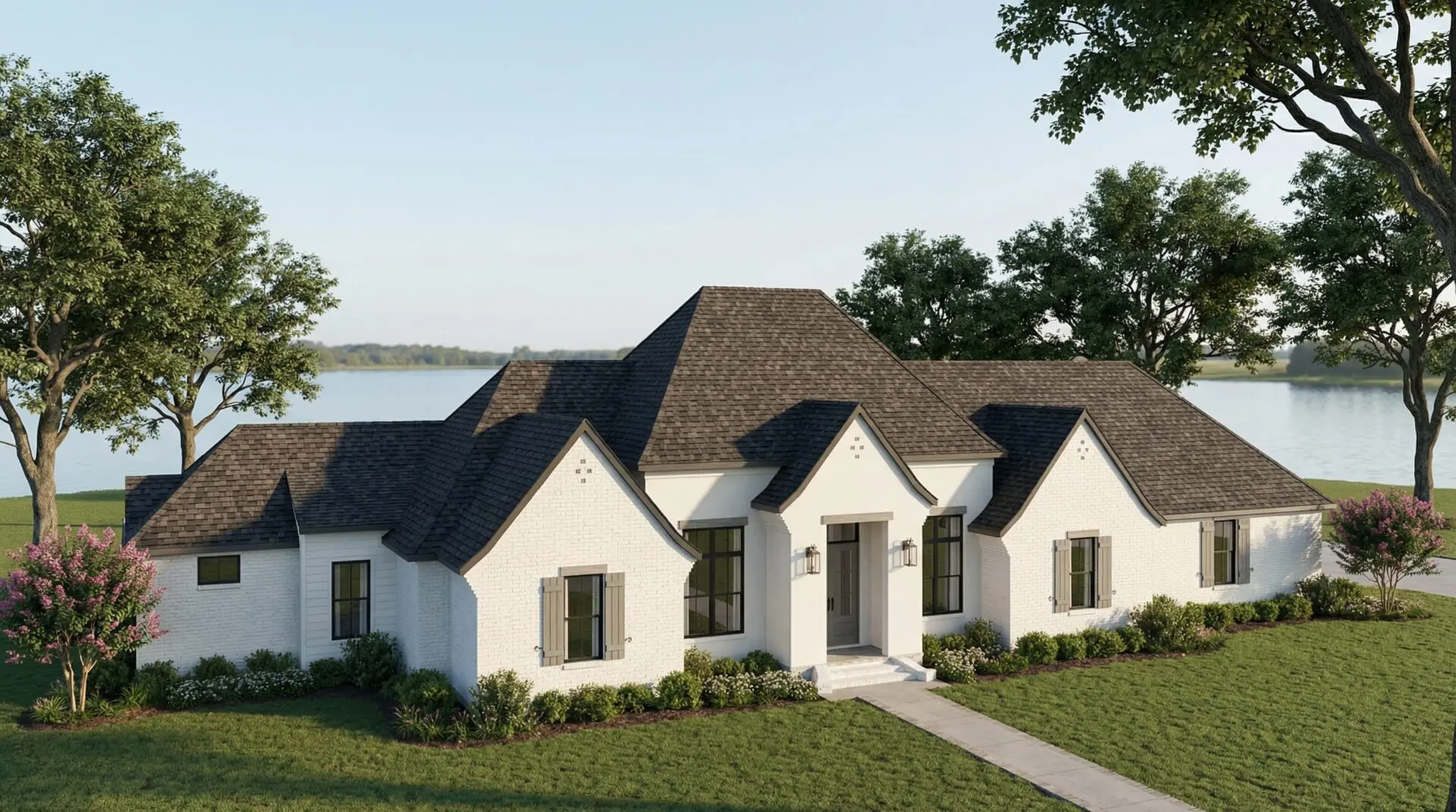 As you approach, the painted white brick whispers stories of timeless beauty, while the complex, steeply-pitched roofline, adorned with dark architectural shingles and gabled projections, evokes a sense of cozy grandeur. The arched entryway, sheltered by a swooping gable and softly lit by wall-mounted lanterns, welcomes you inside.