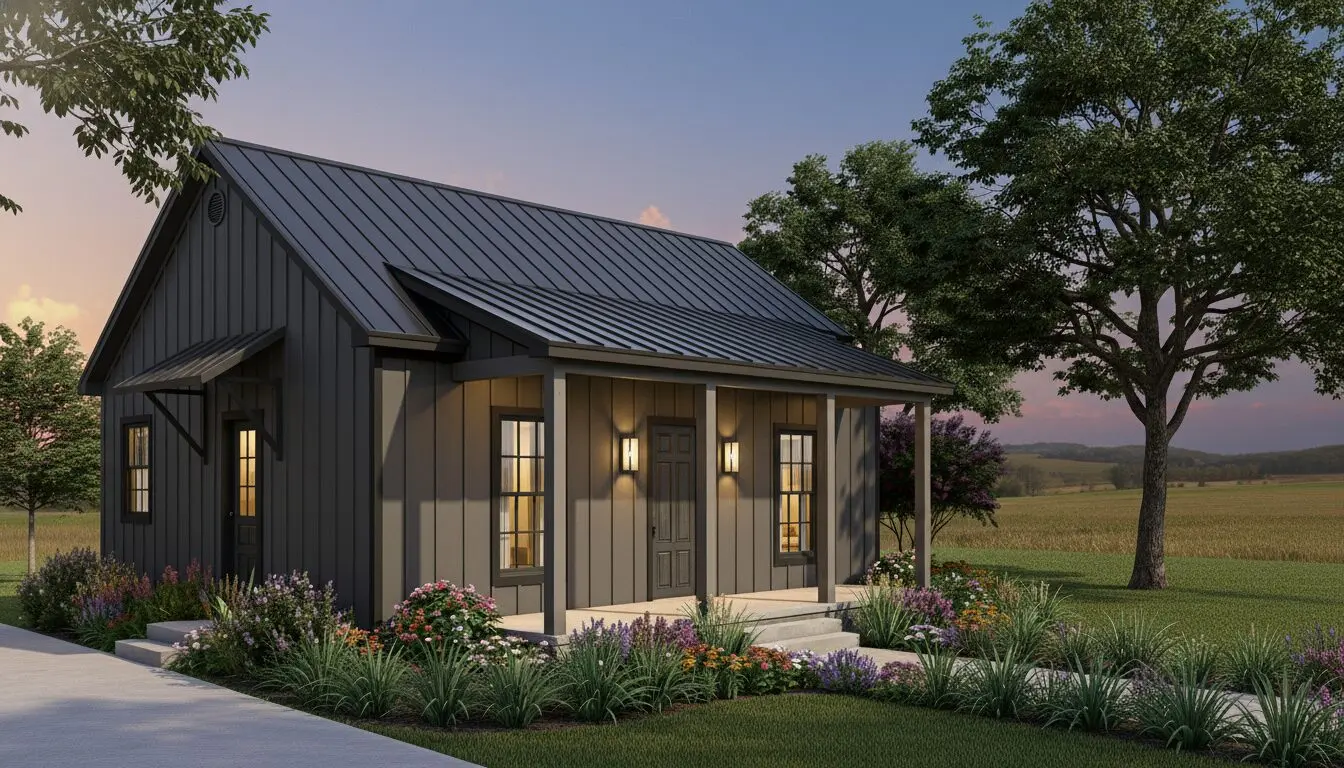 As you approach, the dark grey vertical board-and-batten siding whispers a tale of rustic simplicity, beautifully contrasted by the clean lines of the modern farmhouse style. The dark grey metal standing-seam gable roof extends into a welcoming front porch, supported by sturdy timber posts—perfect for morning coffees or evening chats.