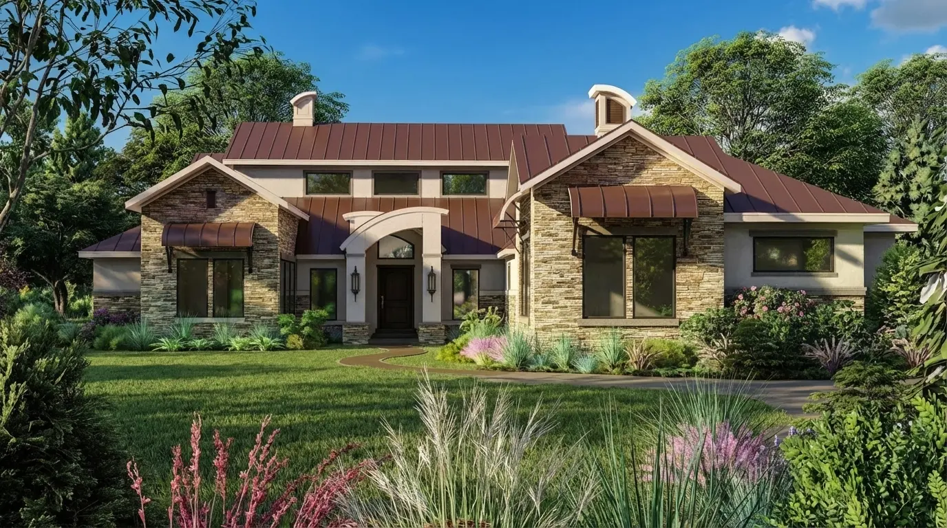 Exterior and Style: The home's exterior blends traditional and contemporary elements, featuring a mixed-material facade of stone and siding, complemented by a deep brown roof. Awnings add character to some windows, while the curved archway at the entrance, supported by columns, creates a welcoming feel.