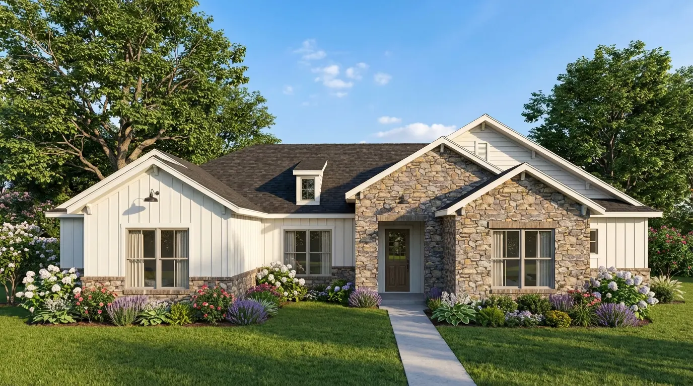 As you approach, the exterior captivates with its blend of natural stone veneer and white board-and-batten siding, a harmonious mix of textures that whispers "welcome." The complex roofline, punctuated by gables and a dormer, adds visual interest, while the large windows promise sun-drenched interiors.