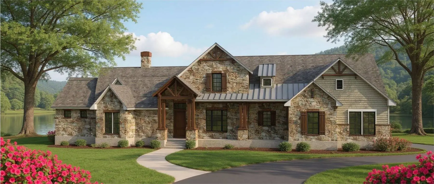 Step into Plan 23-044, where Texas Hill Country charm meets rustic craftsmanship, creating a home that feels both grand and inviting. As you approach, the exterior greets you with a stunning facade of irregular-cut natural stone and horizontal wood siding, all under a complex, multi-leveled roof of charcoal-grey shingles. The heavy timber-framed porch, with its massive wood columns and decorative trusses, welcomes you inside.